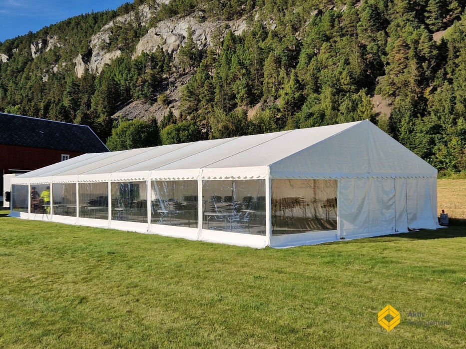 Våre rammetelt har bredder på 3, 6, 9 og 12 meter. De bygges i moduler på 3m i lengden; 3x3m, 3x6m, 3x9m / 6x3m, 6x6m, 6x9m / osv.